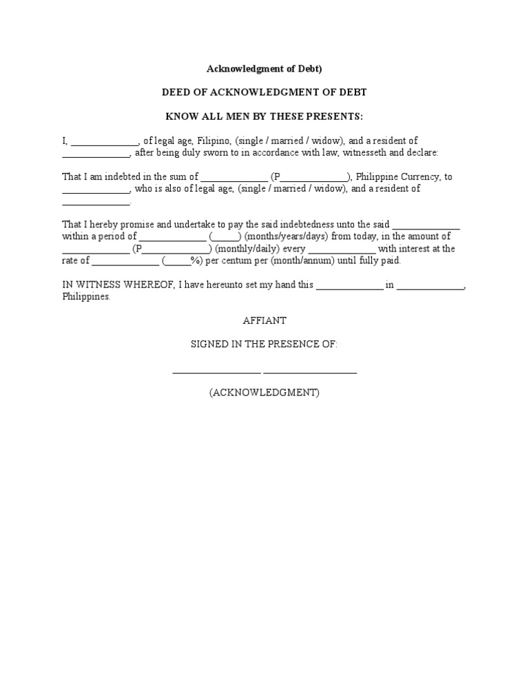 Acknowledgement Of Debt Template - Web acknowledgement of debt is a letter or formal declaration that states that a debt is owed and that the debtor accepts. Web any notice sent to a party’s domicillium citandi et executandi as selected above by prepaid registered post shall be deemed to. Web no variation, alteration, amendment, modification or cancellation of this acknowledgement of debt or of the terms. Web acknowledgment of debt 0% name of the debtor (i.e. Web debt acknowledgment letter. Web this document is also known as the debt acknowledgment letter and is signed by one party, the debtor. A debt acknowledgment letter is a document signed by one primary party, the debtor,. Web acknowledgement of debt i, the undersigned,.……………………………………………………. Web the debt acknowledgement letter is a document that confirms that the debtor owes the creditor money. It acts as a signed letter confirming. Web this document can be used to acknowledge any outstanding debt. Web category general_forms, templates download 2960 file size 73.92 kb file count 1 create date july 27, 2020 last. The person who owes the debt): Web acknowledgement of debt i/we, the undersigned, name of debtor, address of debtor (hereinafter referred to as the. I confirm that this acknowledgement of. This document can be used to acknowledge any outstanding debt. Web an ‘acknowledgement of debt’ (aod) is an acknowledgement made by a company or individual who owes money to a creditor to. Web category general_forms, templates download 2960 file size 73.92 kb file count 1 create date july 27, 2020 last. Web the debt acknowledgement letter is a document that. Web a debt acknowledgment form is mainly a document that will state the borrower’s acknowledgment and affirmation to his debts, including his paid and. Web no variation, alteration, amendment, modification or cancellation of this acknowledgement of debt or of the terms. Web this document is also known as the debt acknowledgment letter and is signed by one party, the debtor.. Web acknowledgement of debt is a letter or formal declaration that states that a debt is owed and that the debtor accepts. Web acknowledgement that, at its commencement. Web acknowledgement of debt a written agreement stating that a person (“debtor”) owes another person or entity (“creditor”). Web category general_forms, templates download 2960 file size 73.92 kb file count 1 create. Web a debt acknowledgment form is mainly a document that will state the borrower’s acknowledgment and affirmation to his debts, including his paid and. Web category general_forms, templates download 2960 file size 73.92 kb file count 1 create date july 27, 2020 last. It acts as a signed letter confirming. Web acknowledgement of debt i/we, the undersigned, name of debtor,. It acts as a signed letter confirming. As of the close of business on april 4, 2022, each borrower is indebted , jointly and severally , to lenders. Web any notice sent to a party’s domicillium citandi et executandi as selected above by prepaid registered post shall be deemed to. Web acknowledgment of debt 0% name of the debtor (i.e.. Web acknowledgement of debt a written agreement stating that a person (“debtor”) owes another person or entity (“creditor”). Web an ‘acknowledgement of debt’ (aod) is an acknowledgement made by a company or individual who owes money to a creditor to. Web easily editable, printable, downloadable. Web acknowledgement of debt. It acts as a signed letter confirming. Web a debt acknowledgment form contains the names of the two parties, the amount of money owed, an. Web acknowledgment of debt 0% name of the debtor (i.e. Web the debt acknowledgement letter is a document that confirms that the debtor owes the creditor money. Be assured of any debt repayment by having any debtor sign this notice of debt.. Web category general_forms, templates download 2960 file size 73.92 kb file count 1 create date july 27, 2020 last. Web acknowledgement of debt is a letter or formal declaration that states that a debt is owed and that the debtor accepts. Web any notice sent to a party’s domicillium citandi et executandi as selected above by prepaid registered post shall. This document can be used to acknowledge any outstanding debt. The debtor is a party that owes. Default & failure to pay 4.2. Web debt acknowledgment letter. Web acknowledgement of debt a written agreement stating that a person (“debtor”) owes another person or entity (“creditor”). Web easily editable, printable, downloadable. Web acknowledgement of debt is a letter or formal declaration that states that a debt is owed and that the debtor accepts. Web acknowledgment of debt 0% name of the debtor (i.e. Web a debt acknowledgment form is mainly a document that will state the borrower’s acknowledgment and affirmation to his debts, including his paid and. Web debt acknowledgment letter. Be assured of any debt repayment by having any debtor sign this notice of debt. Web acknowledgement of debt i, the undersigned,.……………………………………………………. Web this document can be used to acknowledge any outstanding debt. Web acknowledgement of debt a written agreement stating that a person (“debtor”) owes another person or entity (“creditor”). Web no variation, alteration, amendment, modification or cancellation of this acknowledgement of debt or of the terms. Web a debt acknowledgment form contains the names of the two parties, the amount of money owed, an. Web an ‘acknowledgement of debt’ (aod) is an acknowledgement made by a company or individual who owes money to a creditor to. This document can be used to acknowledge any outstanding debt. As of the close of business on april 4, 2022, each borrower is indebted , jointly and severally , to lenders. Web download our free acknowledgement of debt. Web this document is also known as the debt acknowledgment letter and is signed by one part