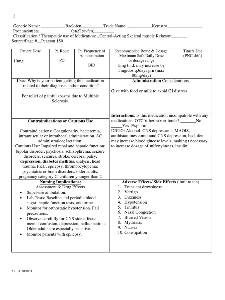 Baclofen Medication Card ACTIVE LEARNING TEMPLATES THERAPEUTIC