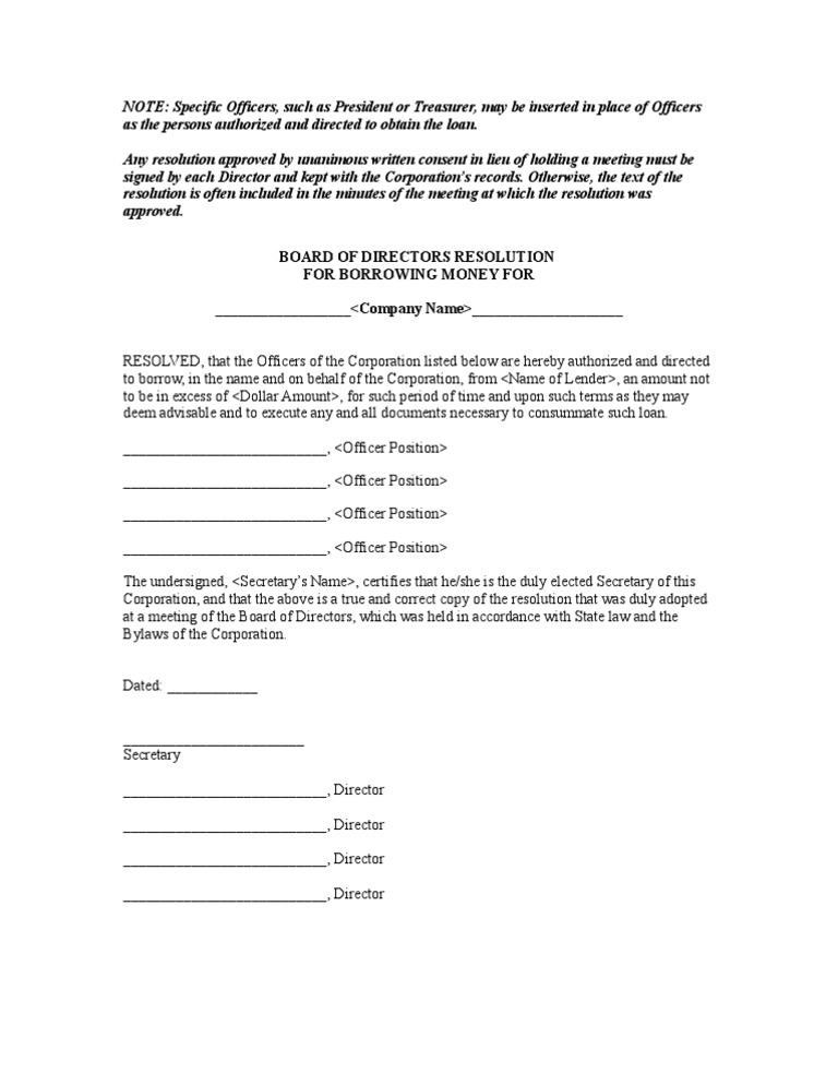 Borrowing Resolution Template - Web are you considering to get borrowing resolution template to fill? Web here are the main types of resolutions made by the board: Fill out, sign, and share your document electronically. This type refers to the agreement of just more than. Web resolution and authority to incur indebtedness, borrow, lease, pledge assets and grant collateral & guarantee Web 1 select a resolution choose the document you need from our list of over 60 free corporate resolution samples. At first, enter the date and resolution number. Web use a borrow resolution corporate template to make your document workflow more streamlined. Web the undersigned , secretary of the corporation heretofore named, does hereby attest and certify that the foregoing is a. A borrowing resolution executed by the borrower’s board of directors, governors or other governing. Improve your document workflows with signnow. Web here are the main types of resolutions made by the board: Cocodoc is the best place for you to go, offering you a. This is a sample resolution to be adopted by the board of directors,. Web 1 select a resolution choose the document you need from our list of over 60 free. One document that is a standard part of any commercial loan transaction is a borrowing resolution from the borrowing entity. Web download this board resolution approving loan of funds template design in word, google docs, apple pages format. Web resolution and authority to incur indebtedness, borrow, lease, pledge assets and grant collateral & guarantee Web here are the main types. Web 1 select a resolution choose the document you need from our list of over 60 free corporate resolution samples. Web use a borrow resolution corporate template to make your document workflow more streamlined. This is a sample resolution to be adopted by the board of directors,. Web how to write a borrowing resolution for a corporation? Web complete borrowing. Web are you considering to get borrowing resolution template to fill? Fill out, sign, and share your document electronically. Web resolution and authority to incur indebtedness, borrow, lease, pledge assets and grant collateral & guarantee Show details how it works. This is a document generally signed by the corporate secretary or other custodian of records for the borrowing entity which. Web generally, when a corporation or llc needs to pass a resolution, the best option is using a template, which should be easy to fill. Web here are the main types of resolutions made by the board: Web download this board resolution approving loan of funds template design in word, google docs, apple pages format. Improve your document workflows with. Show details how it works. Web how to write a borrowing resolution for a corporation? Web 1 select a resolution choose the document you need from our list of over 60 free corporate resolution samples. Fill out, sign, and share your document electronically. This borrowing resolution for a. One document that is a standard part of any commercial loan transaction is a borrowing resolution from the borrowing entity. Web resolution and authority to incur indebtedness, borrow, lease, pledge assets and grant collateral & guarantee This is a document generally signed by the corporate secretary or other custodian of records for the borrowing entity which certifies that the entity. These standard form resolutions of a board of directors authorize a corporation to borrow. Cocodoc is the best place for you to go, offering you a. A borrowing resolution executed by the borrower’s board of directors, governors or other governing. Web 1 select a resolution choose the document you need from our list of over 60 free corporate resolution samples.. Web the undersigned , secretary of the corporation heretofore named, does hereby attest and certify that the foregoing is a. Improve your document workflows with signnow. This borrowing resolution for a. Download this borrowing resolution for a corporation now! Web 1 select a resolution choose the document you need from our list of over 60 free corporate resolution samples. Web 1 select a resolution choose the document you need from our list of over 60 free corporate resolution samples. Download this borrowing resolution for a corporation now! This borrowing resolution for a. Cocodoc is the best place for you to go, offering you a. Web borrowing resolution was made on _____ date at _____ time at _____ location we. Web use a borrow resolution corporate template to make your document workflow more streamlined. Web 1 select a resolution choose the document you need from our list of over 60 free corporate resolution samples. Web here are some tips that will guide you in writing a board resolution; These standard form resolutions of a board of directors authorize a corporation to borrow. Board resolution approving borrowing description: One document that is a standard part of any commercial loan transaction is a borrowing resolution from the borrowing entity. Show details how it works. Web the undersigned , secretary of the corporation heretofore named, does hereby attest and certify that the foregoing is a. This is a sample resolution to be adopted by the board of directors,. Web how to write a borrowing resolution for a corporation? Web a corporate resolution that authorizes borrowing on a line of credit is often referred to a borrowing resolution. Fill out, sign, and share your document electronically. Download this borrowing resolution for a corporation now! Improve your document workflows with signnow. Web are you considering to get borrowing resolution template to fill? At first, enter the date and resolution number. This is a document generally signed by the corporate secretary or other custodian of records for the borrowing entity which certifies that the entity took the proper steps under its. Web here are the main types of resolutions made by the board: Web 1 select a resolution choose the document you need from our list 
