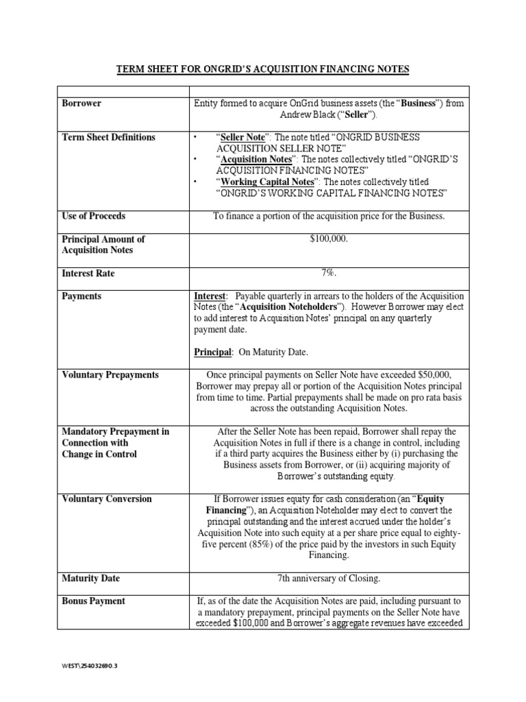 term sheet for ongrid acquisition financing notes Bonds (Finance