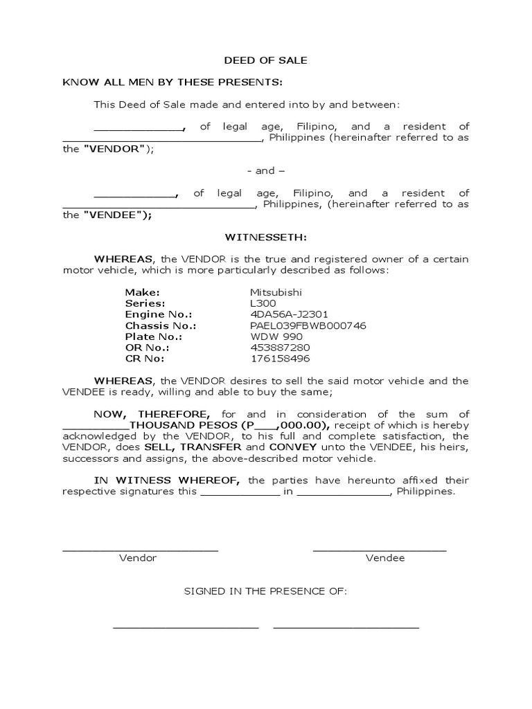 Philippines Deed of Sale of Motor Vehicle Form Download Printable PDF