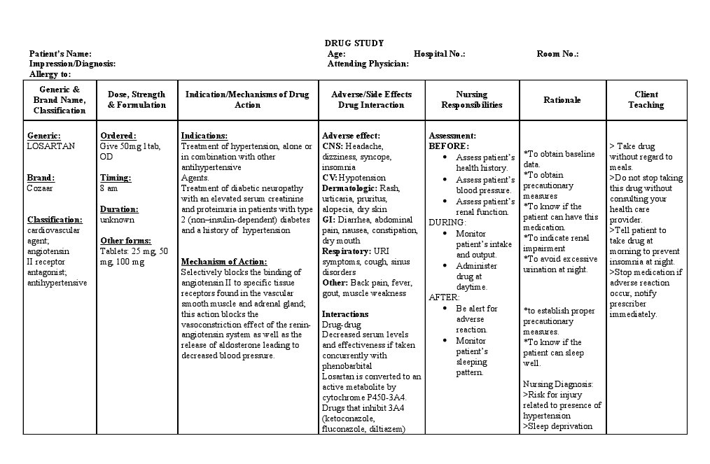 Losartan Medication Template - Medication student name_____ losartan (cozaar). Web losartan potassium (cozaar) is a generic prescription medication used to treat the following conditions: Web losartan comes as 12.5mg, 25mg, 50mg and 100mg tablets. Treat high blood pressure in adults and some children lower the risk of stroke. 50mg to 100mg, taken once a day to treat. Web losartan, sold under the brand name cozaar among others, is a medication used to treat high blood pressure (hypertension). Purpose of medication expected pharmacological action complications. It works by blocking a substance in the body that causes blood. In addition to the use of the medicine your. Web losartan is an angiotensin ii receptor blocker (arb). Purpose of medication expected pharmacological action complications contraindications/precautions. The usual dose for adults is: Purpose of medication expected pharmacological action complications. Web losartan potassium (cozaar) is a generic prescription medication used to treat the following conditions: Web losartan is an angiotensin ii receptor blocker (arb). Angiotensin ii receptor blockers (arbs)generic name:. Web losartan is in a class of medications called angiotensin ii receptor antagonists. Web drug card template student name: 50mg to 100mg, taken once a day to treat. It works by blocking a substance in the body that causes blood. Web losartan is in a class of medications called angiotensin ii receptor antagonists. Web losartan comes as 12.5mg, 25mg, 50mg and 100mg tablets. In addition to the use of the medicine your. 50mg to 100mg, taken once a day to treat. Web drug card template student name: 50mg to 100mg, taken once a day to treat. This type of medicine also. The usual dose for adults is: Find out how losartan treats high blood pressure (hypertension) and heart failure, and how. Angiotensin ii receptor blockers (arbs)generic name:. The usual dose for adults is: 50mg to 100mg, taken once a day to treat. Web drug card template student name: Web losartan potassium (cozaar) is a generic prescription medication used to treat the following conditions: It works by blocking a substance in the body that causes blood. Web angiotensin 2 receptor blockers are a type of medicine used to treat high blood pressure. Web losartan comes as 12.5mg, 25mg, 50mg and 100mg tablets. It works by blocking the action of certain natural. It works by blocking a substance in the body that causes blood. Web losartan potassium (cozaar) is a generic prescription medication used to treat the. It works by blocking the action of certain natural. The usual dose for adults is: Angiotensin ii receptor blockers (arbs)generic name:. Purpose of medication expected pharmacological action complications. Web losartan, sold under the brand name cozaar among others, is a medication used to treat high blood pressure (hypertension). Web drug card template student name: Find out how losartan treats high blood pressure (hypertension) and heart failure, and how. Web losartan potassium (cozaar) is a generic prescription medication used to treat the following conditions: Web angiotensin 2 receptor blockers are a type of medicine used to treat high blood pressure. Web losartan is in a class of medications called. Web losartan potassium (cozaar) is a generic prescription medication used to treat the following conditions: Web angiotensin 2 receptor blockers are a type of medicine used to treat high blood pressure. It works by blocking the action of certain natural. The usual dose for adults is: Medication student name_____ losartan (cozaar). Web losartan, sold under the brand name cozaar among others, is a medication used to treat high blood pressure (hypertension). Purpose of medication expected pharmacological action complications contraindications/precautions. Angiotensin ii receptor blockers (arbs)generic name:. This type of medicine also. Treat high blood pressure in adults and some children lower the risk of stroke. It works by blocking the action of certain natural. 50mg to 100mg, taken once a day to treat. Find out how losartan treats high blood pressure (hypertension) and heart failure, and how. Web losartan potassium (cozaar) is a generic prescription medication used to treat the following conditions: It works by blocking a substance in the body that causes blood. Web losartan is in a class of medications called angiotensin ii receptor antagonists. In addition to the use of the medicine your. Web angiotensin 2 receptor blockers are a type of medicine used to treat high blood pressure. The usual dose for adults is: Angiotensin ii receptor blockers (arbs)generic name:. This type of medicine also. Web losartan comes as 12.5mg, 25mg, 50mg and 100mg tablets. Web drug card template student name: Medication student name_____ losartan (cozaar). Purpose of medication expected pharmacological action complications contraindications/precautions. Web losartan is an angiotensin ii receptor blocker (arb). Web losartan, sold under the brand name cozaar among others, is a medication used to treat high blood pressure (hypertension). Web it’s a prescription drug that’s used to: Purpose of medication expected pharmacological action complications. Treat high blood pressure in adults and some children lower the risk of stroke. Web it’s a prescription drug that’s used to: Web losartan comes as 12.5mg, 25mg, 50mg and 100mg tablets. This type of medicine also. The usual dose for adults is: Purpose of medication expected pharmacological action complications. Web losartan is an angiotensin ii receptor blocker (arb). In addition to the use of the medicine your. It works by blocking the action of certain natural. Web losartan potassium (cozaar) is a generic prescription medication used to treat the following conditions: 50mg to 100mg, taken once a day to treat. Treat high blood pressure in adults and some children lower the risk of stroke. Web angiotensin 2 receptor blockers are a type of medicine used to treat high blood