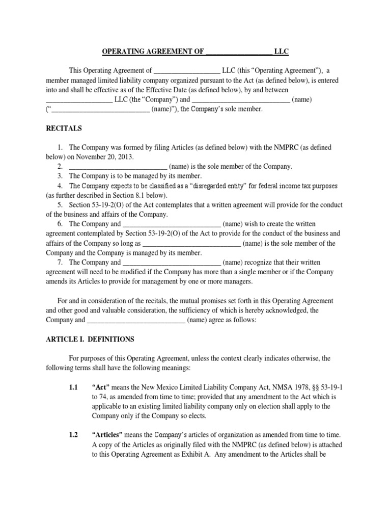 Single Member LLC Operating Agreement Template Tax In The