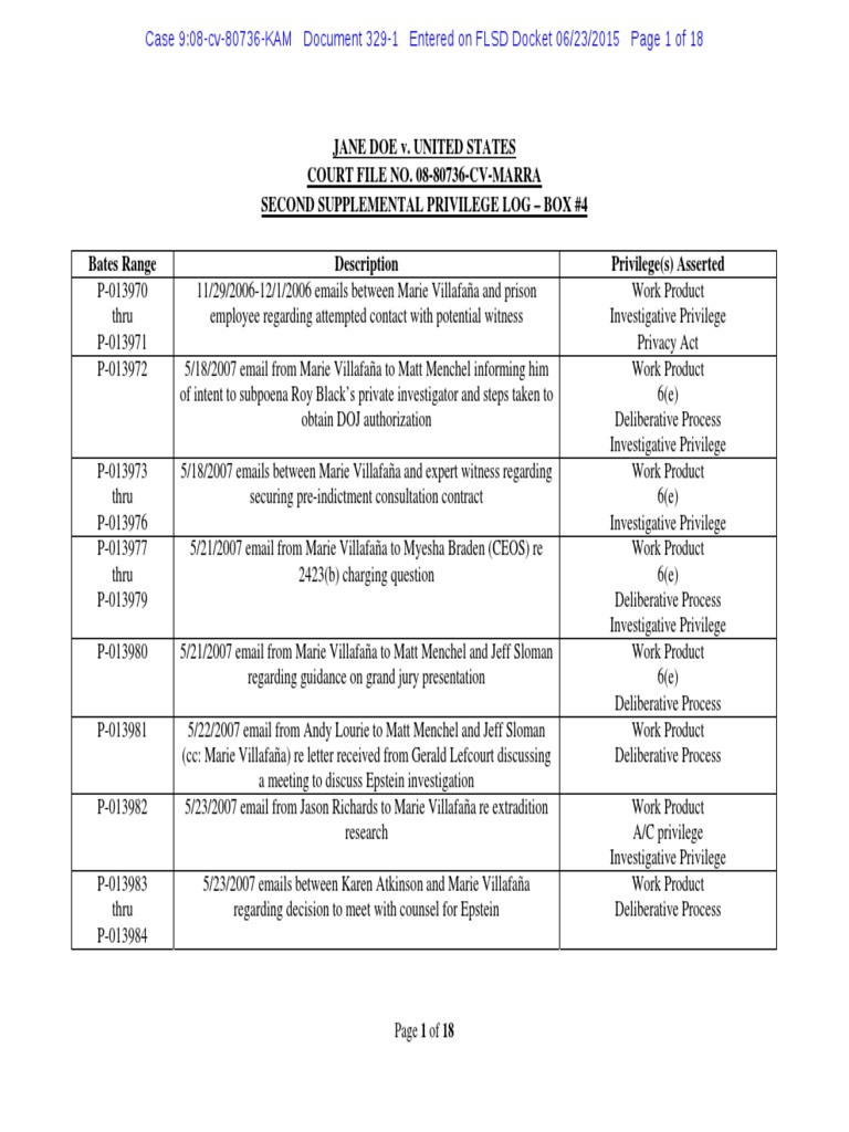 3291 SECOND SUPPLEMENTAL PRIVILEGE LOG BOX 4 Plea Lawsuit