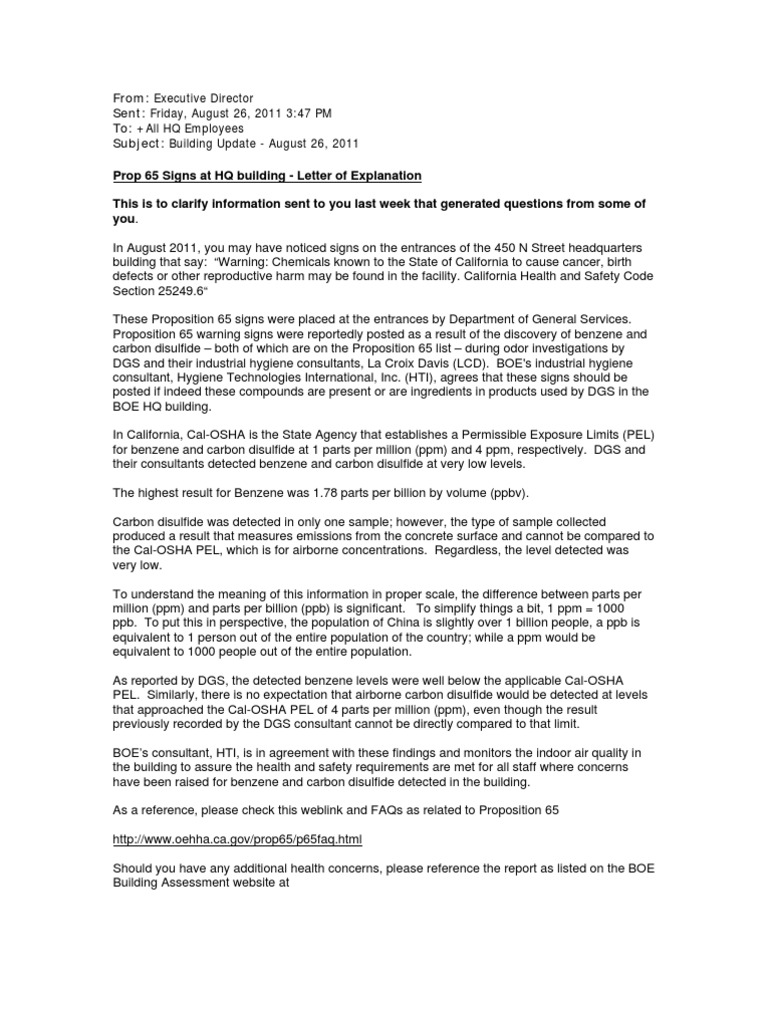 Prop 65 Signs at HQ building Letter of Explanation Benzene