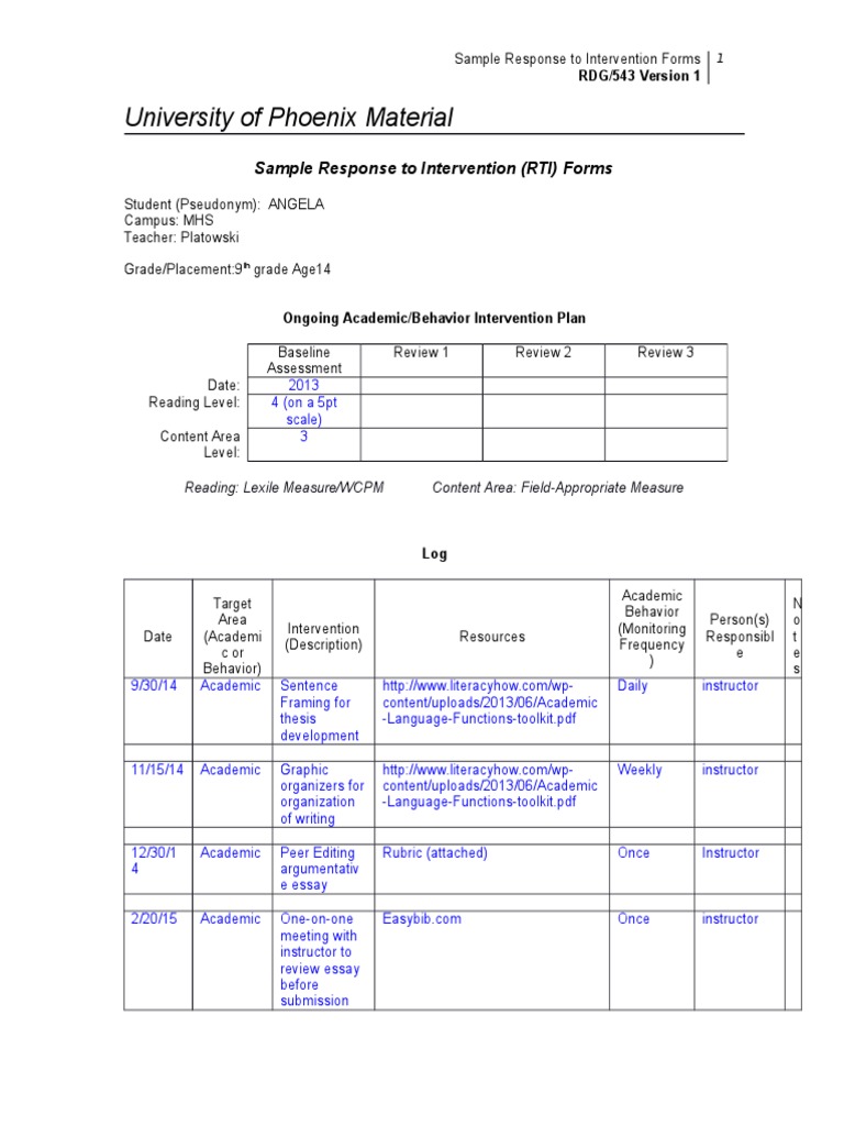 Secondary Student Response To Intervention (Rti) Plan Form printable
