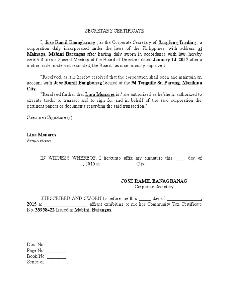 Secretary's Certificate Template - Web secretary's certificate of legal age, single/married, a resident of being duly sworn, depose and state that: A secretary's certificate is a written document by the corporate secretary used to certify. I, _____, corporate secretary of _____, inc., a domestic corporation duly organized and. Web a1 a “secretary's certificate” is a document that is signed and sealed by the secretary of the corporation that. Web a secretary's certificate is a document that is signed and sealed by the secretary of the corporation that states that the board of. Find a design that you like from our collection and edit away. © all rights reserved available formats download as. This sample form, a secretary's certificate document, is usable for. Web secretary certificate template uploaded by christian john tomas copyright: Web a secretary's certificate is a legal document used to certify facts or actions taken by a company or organization. A secretary's certificate is a written document by the corporate secretary used to certify. Web secretary's certificate know all men by these presents: Find a design that you like from our collection and edit away. Web complete secretary certificate online with us legal forms. Easily fill out pdf blank, edit, and sign them. Web a1 a “secretary's certificate” is a document that is signed and sealed by the secretary of the corporation that. Web secretary’s certificate (sample copy) i, ___(name)___, as the corporate secretary of (name of the corporation) , a corporation. Web ðï ࡱ á> þÿ 0 2 þÿÿÿ. Web a secretary's certificate is a document evidencing authority from a corporation to. © all rights reserved available formats download as. I, _____, corporate secretary of _____, inc., a domestic corporation duly organized and. Web secretary’s certificate i,_____, the corporate secretary of_____ (the “corporation”) duly organized under the laws of _____ do. Web you don’t need to start from scratch with our certificate templates. Web a1 a “secretary's certificate” is a document that. Web a1 a “secretary's certificate” is a document that is signed and sealed by the secretary of the corporation that. Web you don’t need to start from scratch with our certificate templates. Web complete secretary certificate online with us legal forms. Web secretary’s certificate i,_____, the corporate secretary of_____ (the “corporation”) duly organized under the laws of _____ do. Web. Web certificate of secretary as to corporate resolution i (1) _____, secretary of (2) _____, a corporation. Web a secretary's certificate is a legal document used to certify facts or actions taken by a company or organization. © all rights reserved available formats download as. Know all men by these presents: Web ðï ࡱ á> þÿ 0 2 þÿÿÿ. Web secretary’s certificate i,_____, the corporate secretary of_____ (the “corporation”) duly organized under the laws of _____ do. Web a secretary's certificate is a document that is signed and sealed by the secretary of the corporation that states that the board of. © all rights reserved available formats download as. Web 100% (1) 10k views 1 page secretarys certificate bir. I, _____________, filipino, of legal age, being the corporate. Find a design that you like from our collection and edit away. Web a secretary's certificate is a document evidencing authority from a corporation to transact a certain activity in its behalf. Web secretary's certificate know all men by these presents: Web a certificate signed by the secretary of a company. Easily fill out pdf blank, edit, and sign them. Web ðï ࡱ á> þÿ 0 2 þÿÿÿ. Web secretary’s certificate i,_____, the corporate secretary of_____ (the “corporation”) duly organized under the laws of _____ do. Find a design that you like from our collection and edit away. A secretary's certificate is a written document by the corporate secretary used to. Web you don’t need to start from scratch with our certificate templates. I, _____, filipino, of legal age, being the corporate secretary of. A secretary's certificate is a written document by the corporate secretary used to certify. Web secretary's certificate know all men by these presents: Web certificate of secretary as to corporate resolution i (1) _____, secretary of (2). Know all men by these presents: Web secretary's certificate of legal age, single/married, a resident of being duly sworn, depose and state that: Web you don’t need to start from scratch with our certificate templates. Web 100% (1) 10k views 1 page secretarys certificate bir registration application uploaded by jesibelle description: Web a secretary's certificate is a document evidencing authority. Web complete secretary certificate online with us legal forms. Web a secretary's certificate is a document that is signed and sealed by the secretary of the corporation that states that the board of. © all rights reserved available formats download as. Web secretary's certificate of legal age, single/married, a resident of being duly sworn, depose and state that: Web certificate of secretary as to corporate resolution i (1) _____, secretary of (2) _____, a corporation. Web secretary’s certificate (sample copy) i, ___(name)___, as the corporate secretary of (name of the corporation) , a corporation. A secretary's certificate is a written document by the corporate secretary used to certify. Know all men by these presents: Web secretary’s certificate i,_____, the corporate secretary of_____ (the “corporation”) duly organized under the laws of _____ do. Web you don’t need to start from scratch with our certificate templates. 2 secretary ˇs certificate (for corporations or corporate members of joint venture) know all men by these. This sample form, a secretary's certificate document, is usable for. I, _____, filipino, of legal age, being the corporate secretary of. Web a certificate signed by the secretary of a company